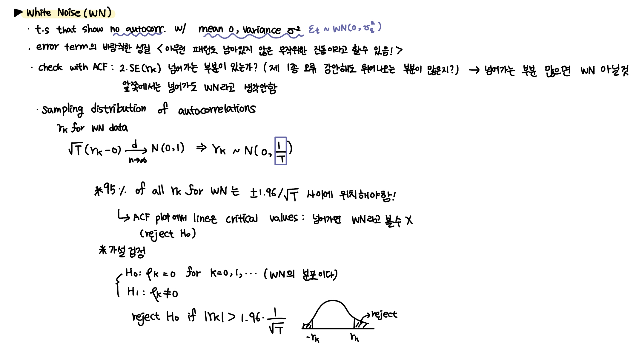 - smapling distribution of autocorrelation을 활용한 가설 검정 과정을 통해 통계적으로 WN인지의 여부 파악 가능 (영가설: WN에의 분포임)