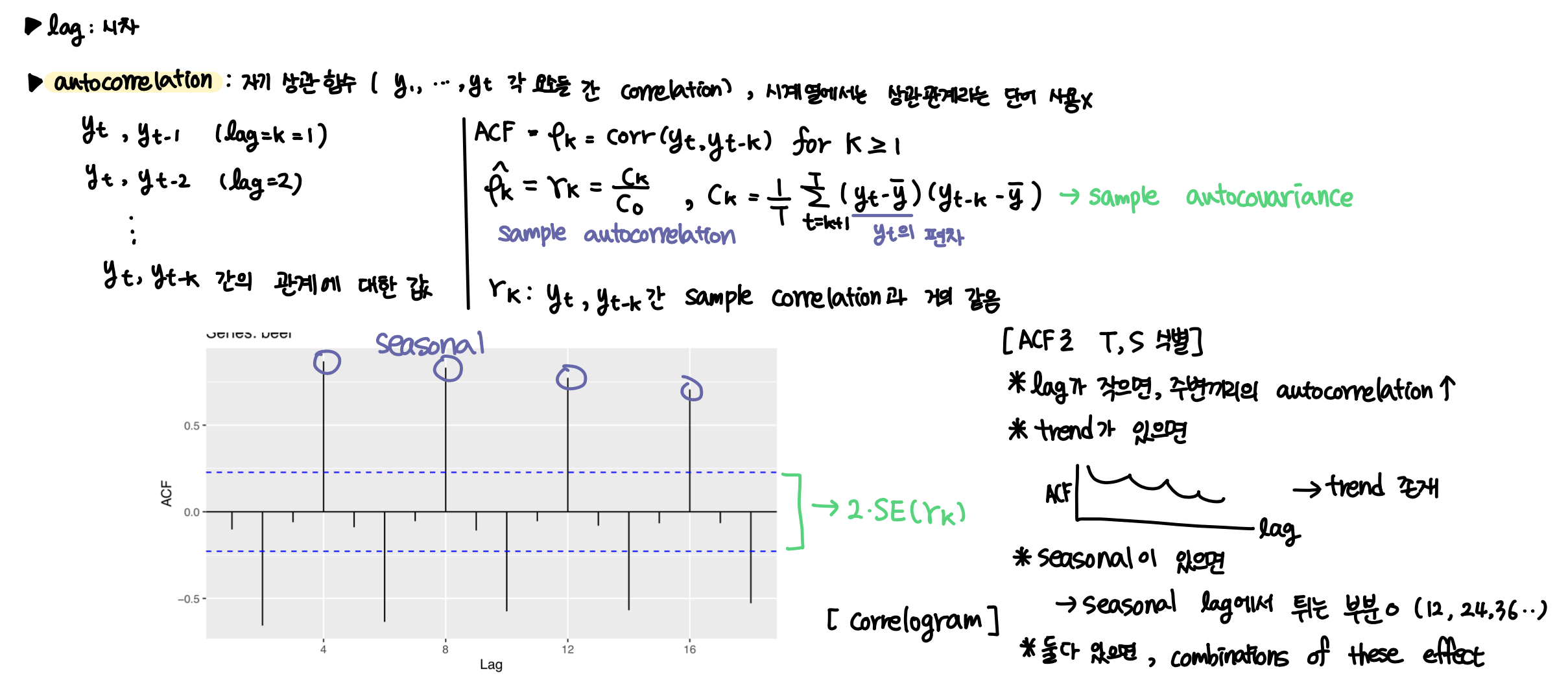 - 시계열에서는 correlation 대신 autocorrelation, 즉 자기 상관계수라는 개념이 사용됨: $y_t$ 와 $y_{t-k}$ 간의 관계에 대한 값
